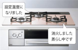 機能・安全装置 | ・調理油過熱防止装置 ・高温自動温度調節機能 ・焦げつき消火機能 ・温度設定機能 ・炊飯機能 ・湯わかし機能 ・コンロタイマー機能 ・コンロ消し忘れ消火機能 ・高温炒め機能 ・ラク点火 ・グリル調理タイマー ・グリル過熱防止センサー ・オートグリル機能 ・電池交換サイン ・音声ガイド ・感震停止機能 ・風量自動切替のレンジフード連動機能 ・点火ロック |