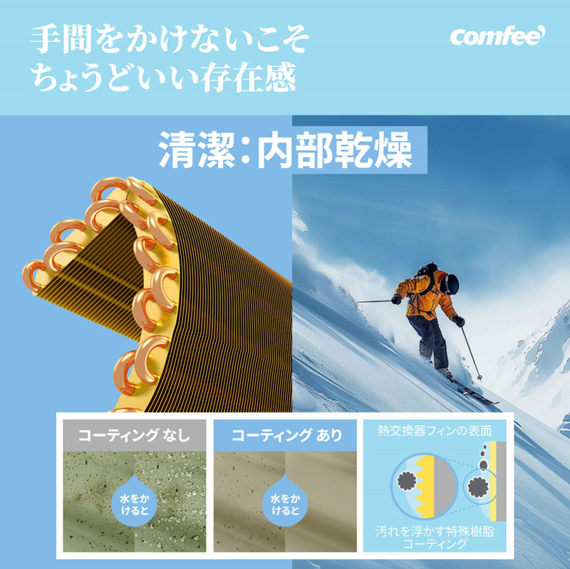 清潔(内部乾燥) 熱交換器に水がなじみやすいコーティングを採用。 結露水が汚れと物質の間に入り込むことで、 汚れを浮かせて洗い流します。 |