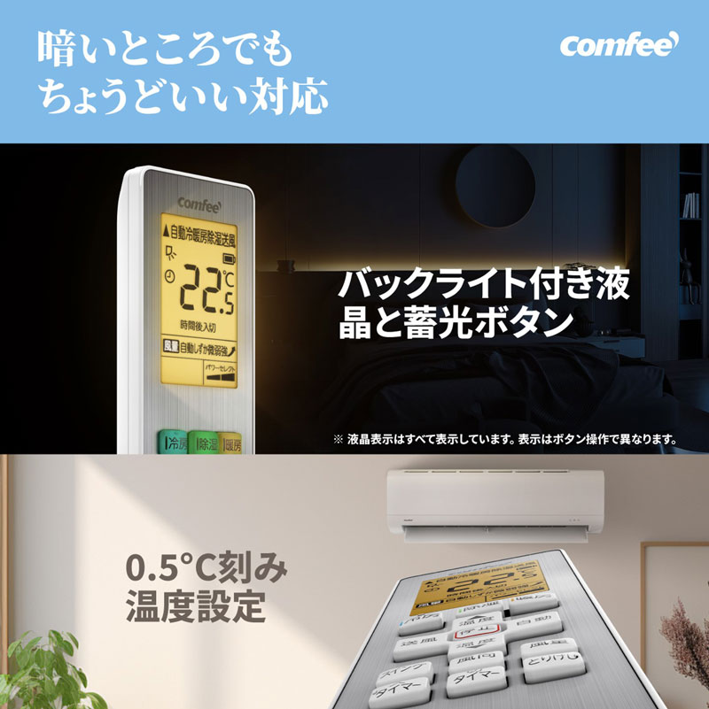 使いやすいリモコン 薄暗い環境に設定状況の確認ができて、 ボタン操作ができます。0.5℃ごとに変更可能。 最適な快適により近づけます。 |